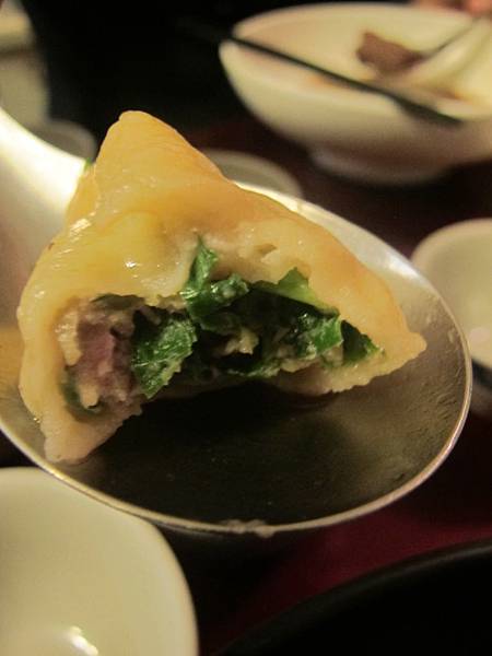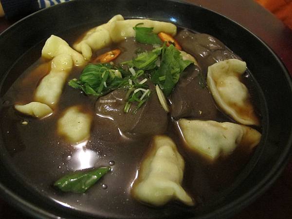 酸湯餃($160) 跟雙紅拉麵一樣的湯頭, 鴨血配上十顆水餃, 餃子皮彈牙, 內餡是碎豬肉加青江菜, 不柴, 非常好吃. Dumpling in Beef and Duck's blood parcel Soup - the dumpling's filling was made of minced pork and minced Chinese vegetable which was moist and tasty.