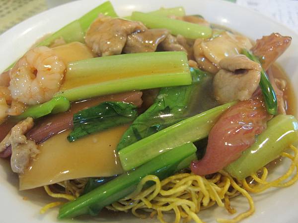 港式炒麵 ($130) - 幾乎每桌都點. 麵條炸的香香酥酥脆脆的. 上面淋上勾芡的海鮮及肉片, 港味十足, 難怪是招牌菜. Hong Kong Style Deep Fried Noodle - a very popular dish. Crispy deep fried noodle with seafood, meat and green vegetables.