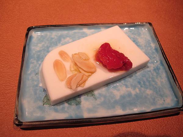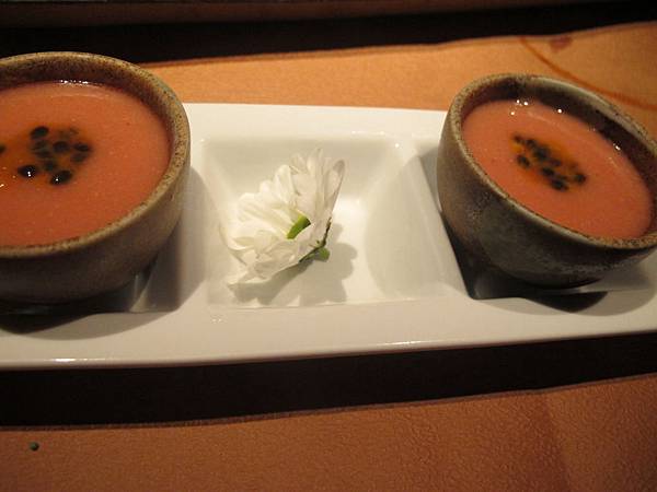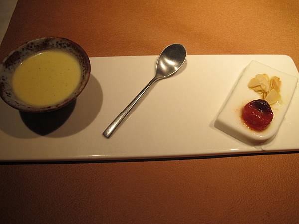 玉米冷湯與花生豆腐 - 玉米冷湯十分的甜, 深受小朋友的喜愛. 和它反差的花生豆腐沒有味道. 也沒有花生味兒. Corn Cold Soup and Peanut Tofu - soup was chilling and sweet. However, tofu was very bland.