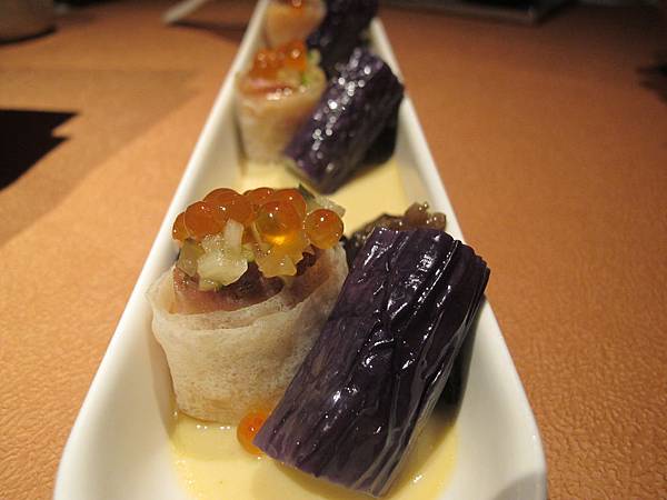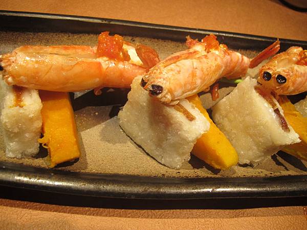 烤蝦, 烏魚子麻糬與蒸南瓜 - 烤蝦烤的適中, 肉質鮮甜, 連殼都可以吃. 烏魚子麻糬是我第一次見到的組合, 外面微脆, 搭上烏魚子自有的香氣, 非常的特別. Grilled Prawn, Mullet Roe in Mochi and Steamed Pumpkin - Prawn was fresh and sweet. Baked mullet roe is a traditional Taiwanese ingredient always served during Chinese New Year - symbolising prosperity. A tasty combination.