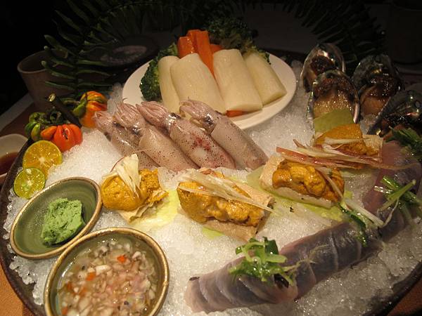 四人份的海膽, 九孔, 烏賊, 生魚包紫菜 - 海膽很鮮甜, 下面鋪了豆皮. 真想追加一份. 其他的海鮮也很新鮮歐. 附上川燙的皎白筍, 綠花椰菜及紅蘿蔔. Raw seafood platter (serving for four) - my top pick got to be uni (sea urchin). Thin sheet of bean curd was placed under uni. An interesting yet tasty combination.