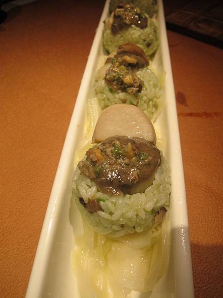 荷風拌飯佐干貝 - 新鮮的干貝與炒飯一人一小球, 下面鋪了炒高麗菜, 味道偏淡. Rice ball with fresh Scallop - stir fried cabbage served at the bottom of the dish. The taste was bit bland overall.