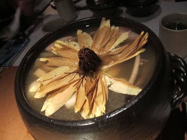 荷花雞湯 - 乾燥的荷花是上桌後才放的, 花瓣有淡淡的香味, 花蕊就有點苦啦. 綜合的菇類增添了脆度. 而這雞湯真的是非常的好喝. 豐富的膠質讓我們的嘴唇有黏黏的感覺. 重點是它沒有加味精! Chicken soup with mushroom - the dried water lily was placed after the soup was presented. Flower petals got light aroma yet the stamenpistil was bit bitter. The chicken soup was rich in collagen as I felt like I got glue on my lips. The bonus point was no MSG added!
