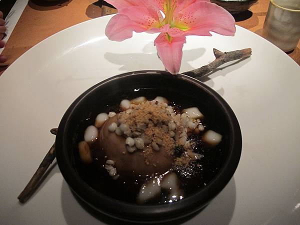 甜點 - 來自大甲的芋頭做成的芋泥, 黑糖小湯圓以及薏仁. 雖然已經吃的很飽, 但是身為芋頭的超級大fans, 不論如何都要嚐嚐. 這甜點料理的非常好吃. 大甲的芋頭好吃不在話下, 與薏仁, 小湯圓的組合很優歐. Dessert - taro paste, dumpling and barley. I enjoyed the dish very much as I am a huge fan of taro. The dessert was not too sweet and the combination of the ingredients was excellent.