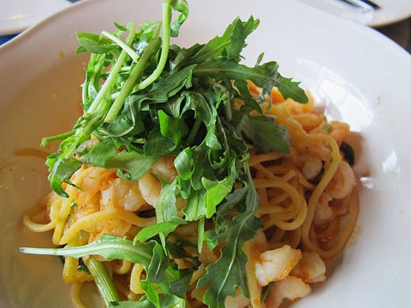 Prawn Linguine GBP12.75 - 蒜味蝦與微微辣的蕃茄醬汁很對味. 上面的rocket中和了油膩感, 夏天吃更為清爽. Fried garlicky prawns, shaved fennel, tomatoes, chilli & rocket - a great dish for summer days!
