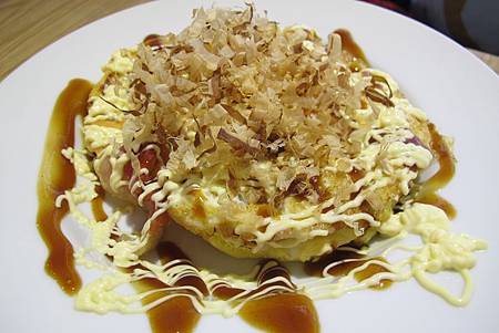 大阪燒鬆餅 $240 這是我在Jamling Cafe的最愛! 美乃滋與柴魚片的底下有一顆荷包蛋與培根片, 跟吃正宗的大板燒一樣好吃! Okonomiyaki - my favourite dish at Jamling. Egg, bacon topped with generous amount of mayo and dried bonito flakes. I'd like it for supper or afternoon tea!